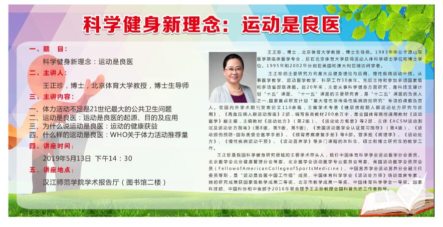 王正珍是我国科学健身研究领域的主要学术带头人,现任中国体育科学学会运动医学分会委员、北京医学会北京健康管理分会常委、北京医学会运动医学专业委员会常委、美国运动医学会资深会员(Fellow of American College of Sports Medicine)、中国营养学会运动营养分会副主任委员等职,是“运动是良医中国工作组”成员、中国体育科学学会《运动处方师》培训首席专家,她的研究成果获国家级教学成果二等奖、北京市教学成果一等奖、中国体育科学学会一等奖。国家科技部、中国科协和中宣部于2016年联合授予王正珍教授全国科普先进工作者称号。