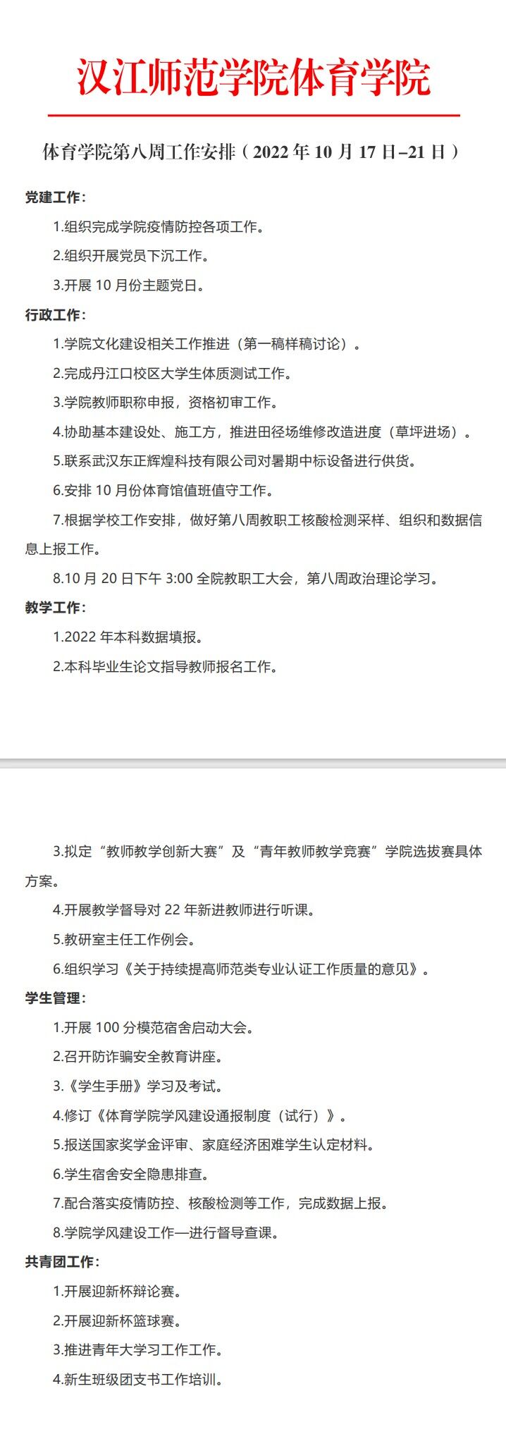 威廉希尔第八周工作安排(2022年10月17日-21日)