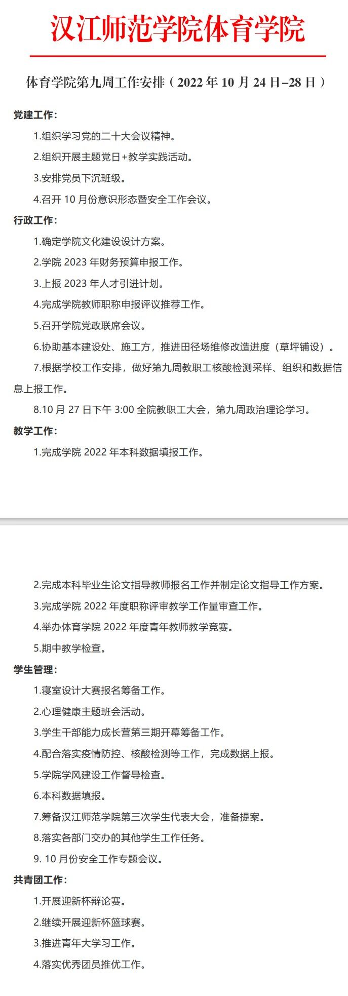 威廉希尔第九周工作安排(2022年10月24日-28日)