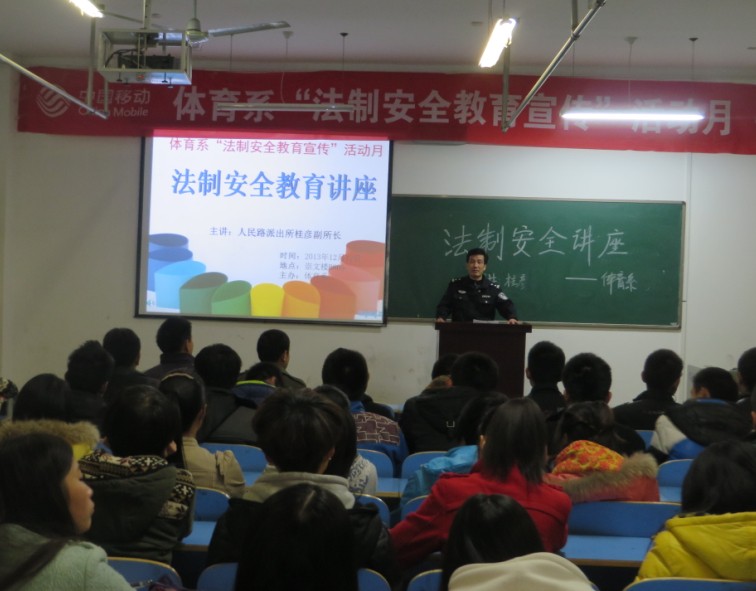 本网讯通讯员杨琦、滕凤仙报道:12月12日晚,体育系在崇文楼B805教室召开“法制安全教育”主题讲座。系党总支书记刘宏、分团委书记赵鹏、辅导员张文杰和13级、12级全体在校员工参加了本次活动,校保卫处吴建军副处长、孙海成科长应邀出席了讲座,该讲座主讲人为人民路派出所桂彦副所长。