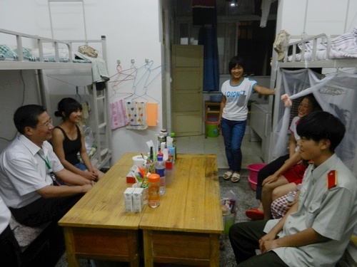 本网讯记者周靖宇报道:9月10日晚上8点50分,天空正下着蒙蒙细雨,气温也下降不少,而位于清美楼的4080等宿舍却欢声笑语不断,党委书记杨郧生在政工干部查寝的第一时间,也冒雨走进员工宿舍,与刚入学的新同学们聊聊家乡话,谈谈校园事,叙叙师生情。