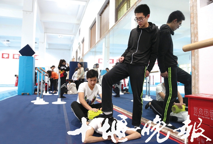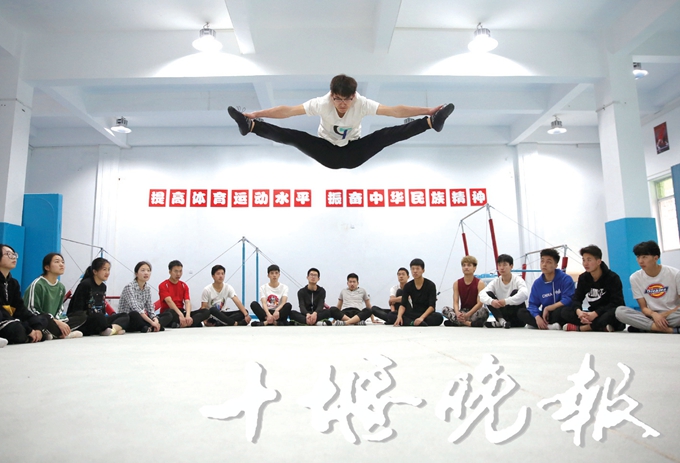 该校18级体操班有50多名员工,其中很多人没有体操基础,每周至少一节的体操课原本让他们十分恐惧,经过老师指导,现在他们纷纷爱上了体操课。