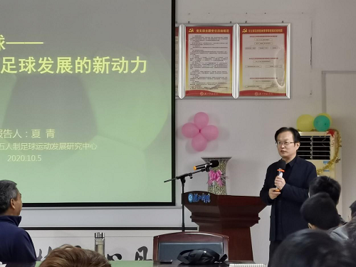 夏青教授从三峡大学五人制足球的发展、五人制足球起源、发展、特点、理念、价值和意义等方面对五人制足球进行全方位介绍。他指出,五人制足球起源于乌拉圭,是世界足球的重要组成部分。为了追赶世界足球强队,目前中国足球呈现出“三多三大”的特点,“三多”即培训多、比赛多、投入精力多、“三大”即政策力度大、经费投入大、开展难度大。