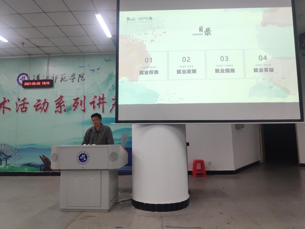 党总支副书记赵盛国从就业形势、就业政策、就业措施、就业答疑四方面向毕业生宣讲了政策、提出了指导意见。他希望各位毕业生积极熟悉《高校毕业生就业创业政策百问(2020年4月版)》《十堰市高校毕业生就业创业政策服务指南》等政策“宝典”,关注“汉师体育”,24365智慧就业微信公众号,注册91网签平台,要积极参与考研、考编、专升本、参军、企事业单位招聘等,要根据《高校毕业生就业协议书填写说明》认真填写就业协议书,主动就业,自力更生,成就精彩人生。