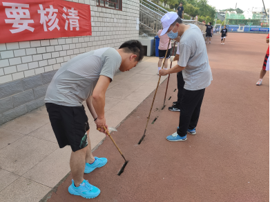 30余名师生组成志愿者团队,积极投入大扫除活动,清扫操场、拔除杂草、清理烟头、清运垃圾、疏通下水道······认真仔细清扫田径场附近的每一个角落,眼及之处,一片繁忙劳动场面。