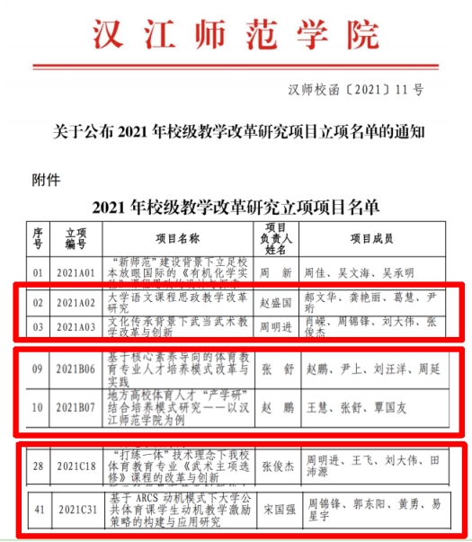 赵盛国聚焦大学语文课程思政教学改革,周明进、张俊杰项目团队关注武术教学改革,分别以《文化传承背景下武当武术教学改革与创新》《“打练一体”技术理念下公司体育教育专业< 武术主项选修>课程的改革与创新》立项,张舒、赵鹏项目团队立足专业人才培养模式,通过《基于核心素养导向的体育教育专业人才培养模式改革与实践》和《地方高校体育人才“产学研”结合培养模式研究——以WilliamHill登录入口为例》项目获批,宋国强团队着力于大学公共体育课改革,试图构建员工动机教学激励策略,并应用于实践。