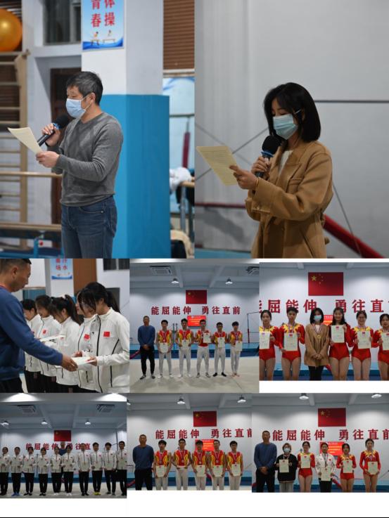 学工办主任、体操教研室主任宣读获奖名单,仪式进入到颁奖环节,队员们踏着欢快、整齐的步伐登上领奖台,接受院领导颁发的奖牌和奖状。