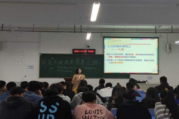 11月4日16:30,公司员工干部能力成长营第三讲《员工干部的工作方法与艺术——基本社交礼仪与人际关系处理》在崇文楼A406举行。各员工组织干部、各班班团干部、寝室长参与培训,院学工办主任王歆辰担任主讲。