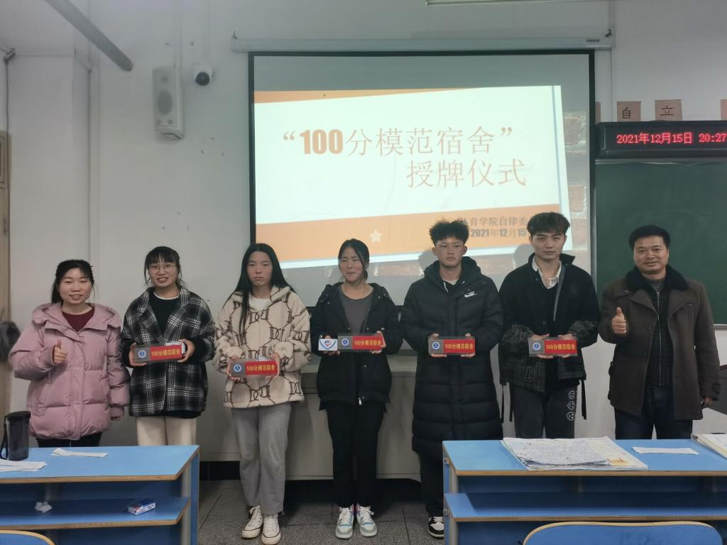院领导为获奖宿舍颁奖,并为11月份获评“100分模范宿舍”荣誉称号的宿舍授牌。