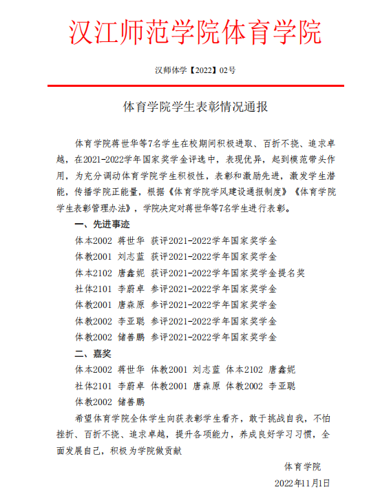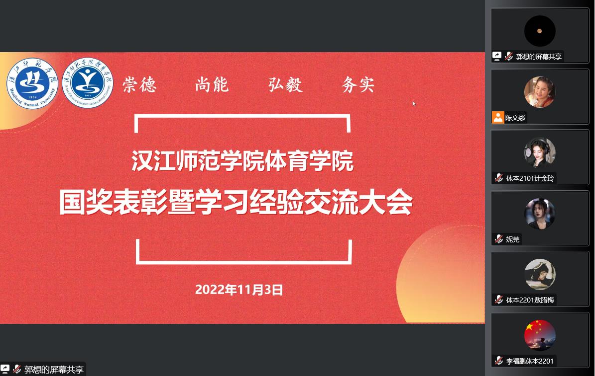 大会邀请了2021-2022学年国家奖学金获得者体本2002班蒋世华、体教2001班刘志蓝、国家奖学金提名奖体本2102班唐鑫妮三位同学分享学习经验。三位榜样结合自身经历、学习生活情况以及社会实践方面的心得,总结经验,提出建议,倾囊相授,毫无保留地分享。蒋世华会在学期开始定下目标并且为之奋斗,刘志蓝会从挫折中汲取前进的力量,越挫越勇,不断进行自我提高,她坦言道大一学年的三件挫事(田径挂科、入学遭到诈骗、手机掉厕所)现在看来都成了她的幸事,正是因为这些挫折,教会她在大二学年积极追赶,全面发展,成就了在大三学年斩获国奖的自己,也勉励大家挫折不可怕,可怕的是不敢正面挫折,重新出发,相信自己可以战胜困难,变得更好。唐鑫妮认为兴趣是最好的老师,平常心会决定做事情的成功与否,凡事要积极去行动,踏踏实实做事,少些功利心,多些求知心。