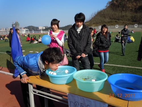 表演结束后,比赛正式开始。在活动现场,同学们临时组队,踊跃报名,循环参加10个游戏活动。“螃蟹接力赛跑”、“摸石头过河”等所有游戏运动内容均强调团队协作、合理分工,各项目均要求组员轮流上场,用最短的时间完成各项游戏。每个项目均充满趣味性与挑战性,整个活动在一片欢声笑语中展开。