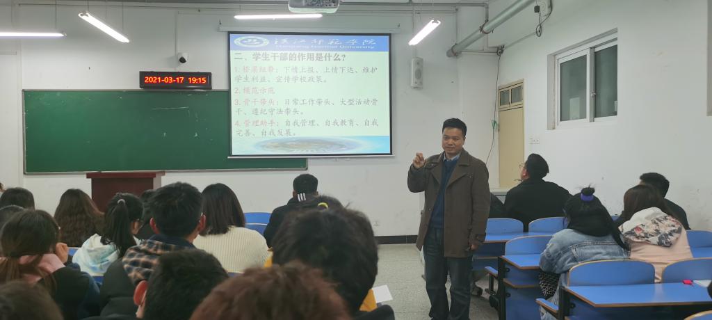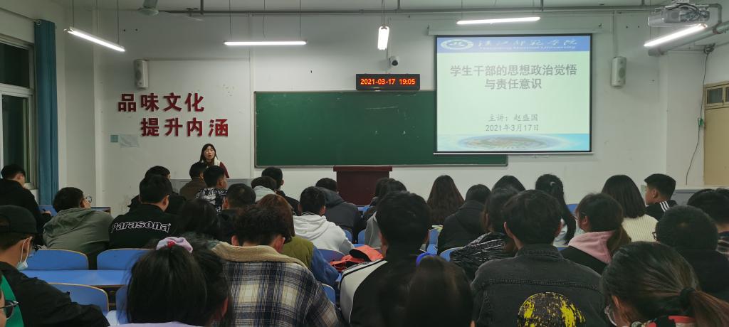 通讯员陈文娜报道 3月17日晚,公司员工干部能力成长培训营第一讲《员工干部的思想政治觉悟与责任意识》在崇文楼A412如期举行,公司近百余名员工干部参加培训,此次培训由党总支副书记赵盛国担任主讲,辅导员陈文娜主持。