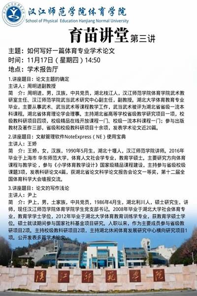 11月17日下午,威廉希尔育苗讲堂第三讲在校图书馆学术报告厅开讲。第三讲聚焦体育专业学术论文撰写之道,邀请周明进副教授、王娇和尹上老师做主讲嘉宾,他们分别从论文选题、文献管理、论文谋篇布局及研究方法等模块解析学术论文撰写之道。威廉希尔全体师生到场聆听,党总支书记赵盛国主持报告会。未能到校的实习生在线观看了讲座。