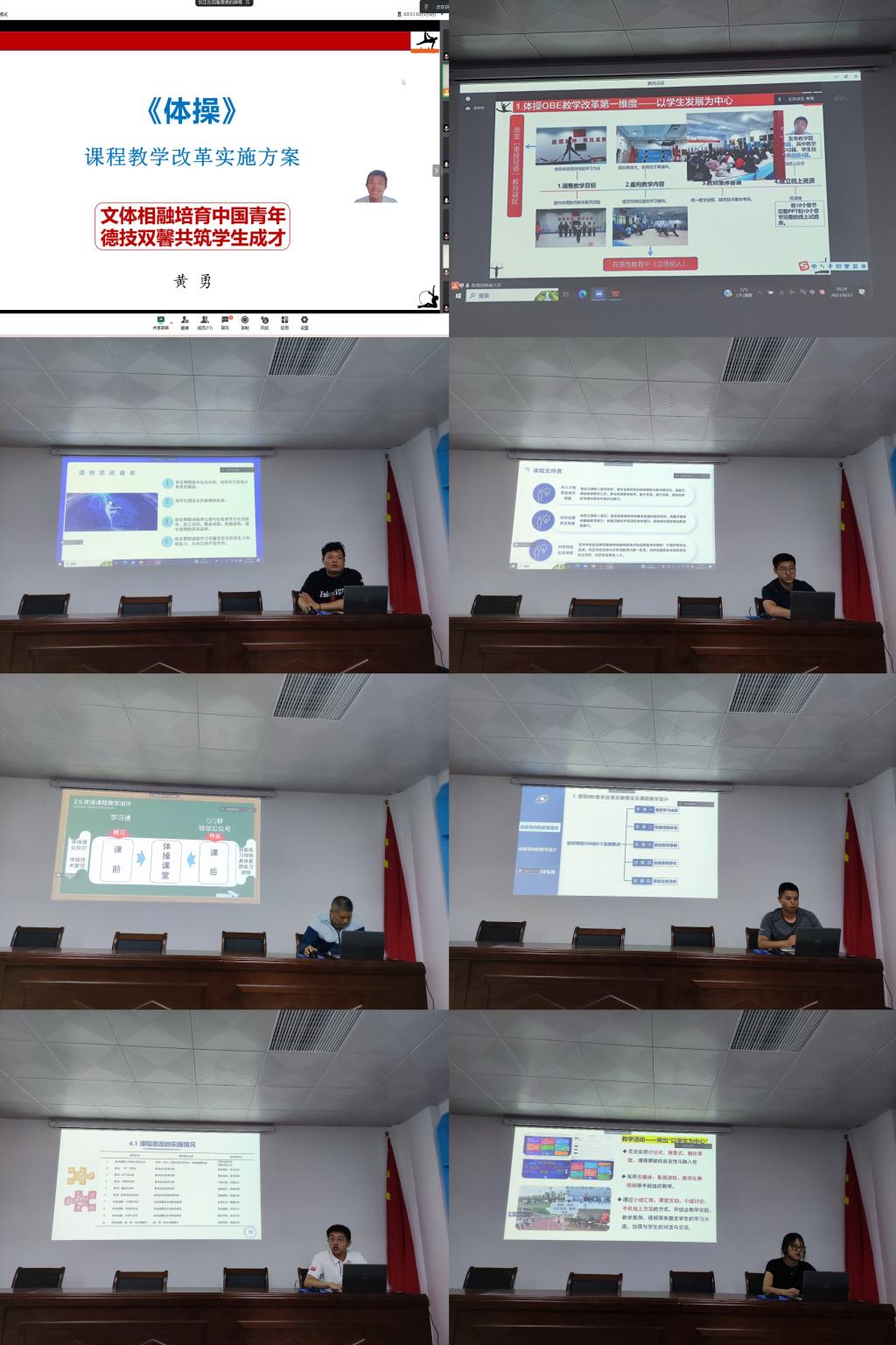 两名专业负责人说专业结束后,老师们根据本次活动安排认真准备了说课PPT,根据抽签顺序,以课程建设和课程思政为出发点,从课程定位、课程目标、课程内容、教学手段等方面谈自己对所带课程的理解,依次进行说课。其中,王娇老师的《体育课程与教学论》结合课程教学进行了深入思考,黄勇老师的《体操》课程图文并茂,术语专业,高度凝练,突出课程思政,并对该课程深入而具体地展开了阐述。