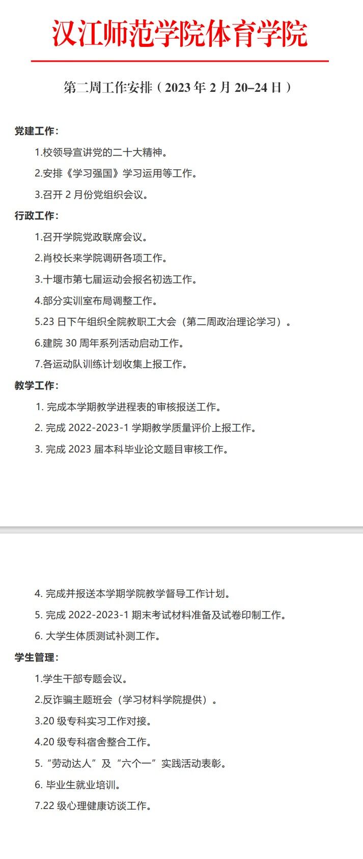 威廉希尔第二周工作安排(2023年2月20日-24日)