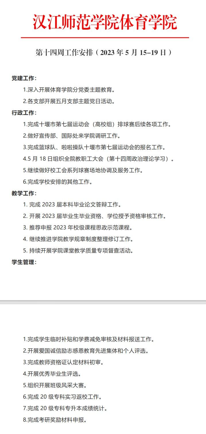 威廉希尔第十四周工作安排(2023年5月15-19日)