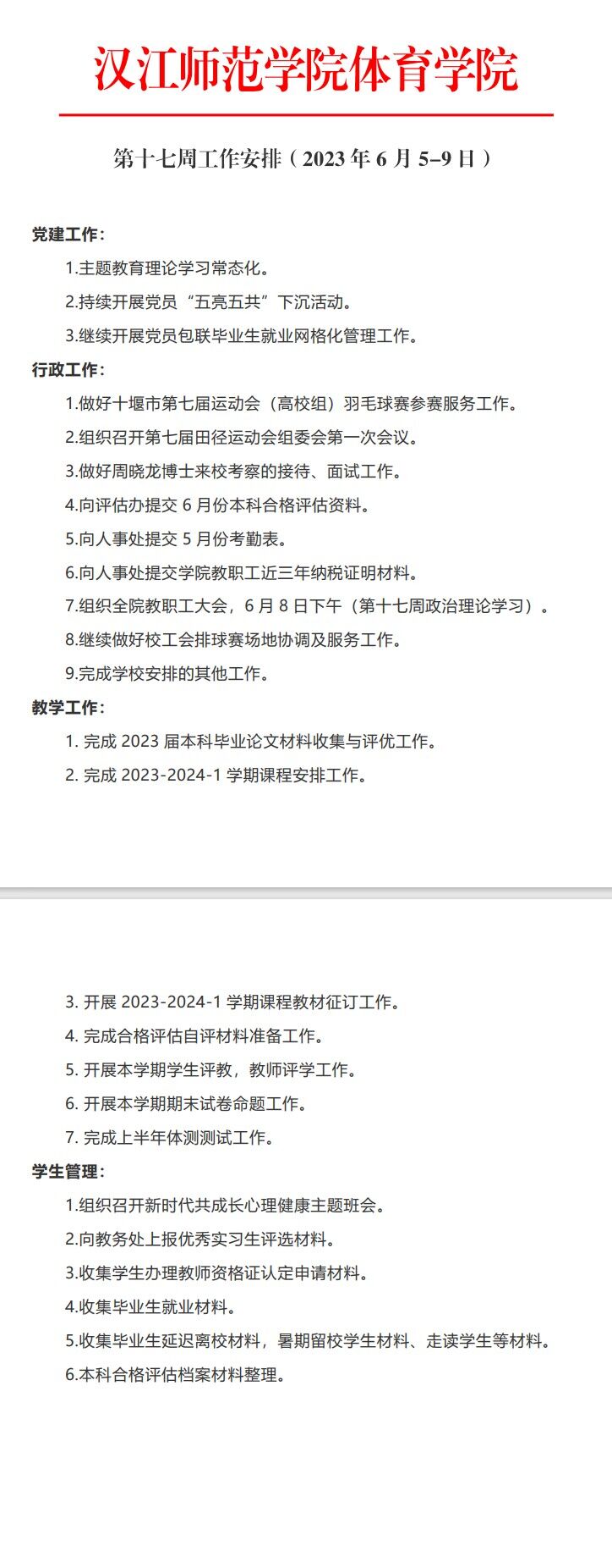 威廉希尔第十七周工作安排(2023年6月5-9日)