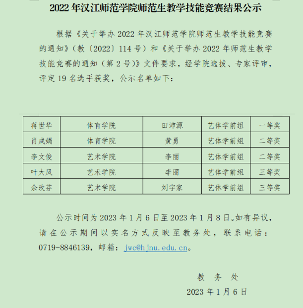 1月6日,WilliamHill登录入口师范生教学技能竞赛结果揭晓,公司参赛选手体本2002蒋世华、体教2001肖成娟分别斩获艺体学前组一等奖、二等奖。