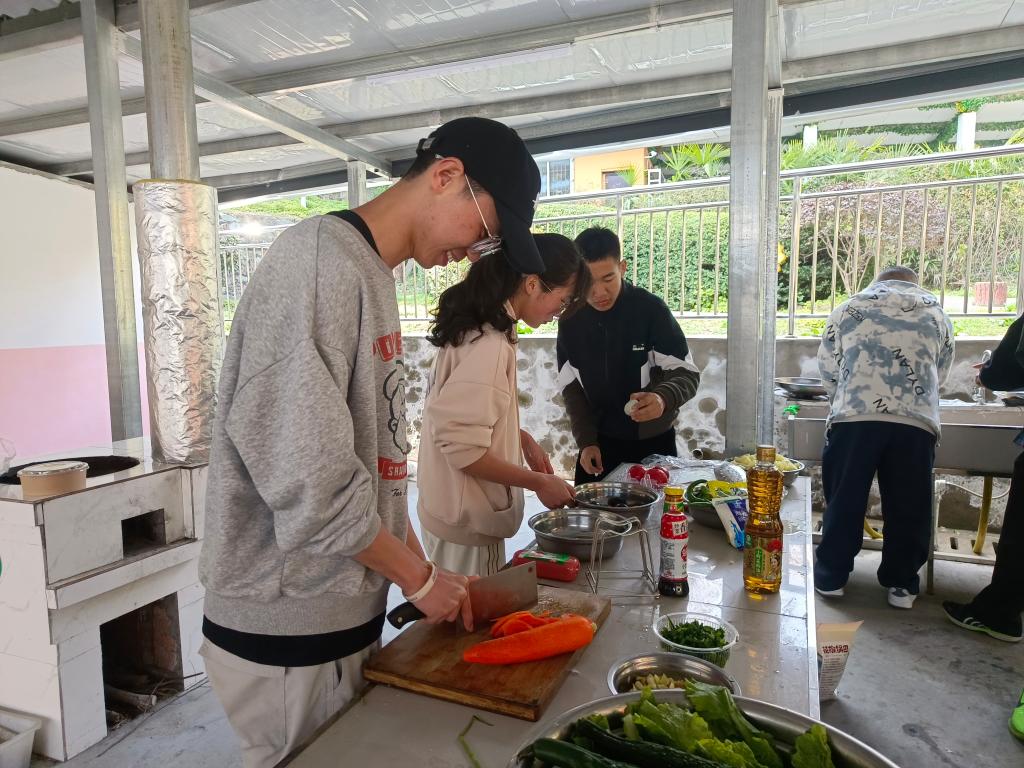 仪式结束,团建游戏开始,根据活动策划,团队开展了桃花朵朵开、智慧迷宫、信任背摔、穿越电网等团建游戏,并进行自助午餐,各组员工干部精诚合作,互帮互助,纷纷为团队贡献力量,砍柴、生火、洗菜、炒菜、摆盘忙得热火朝天。全体员工干部乐在其中,在这个阳光明媚的午后,到处充满着欢声笑语。