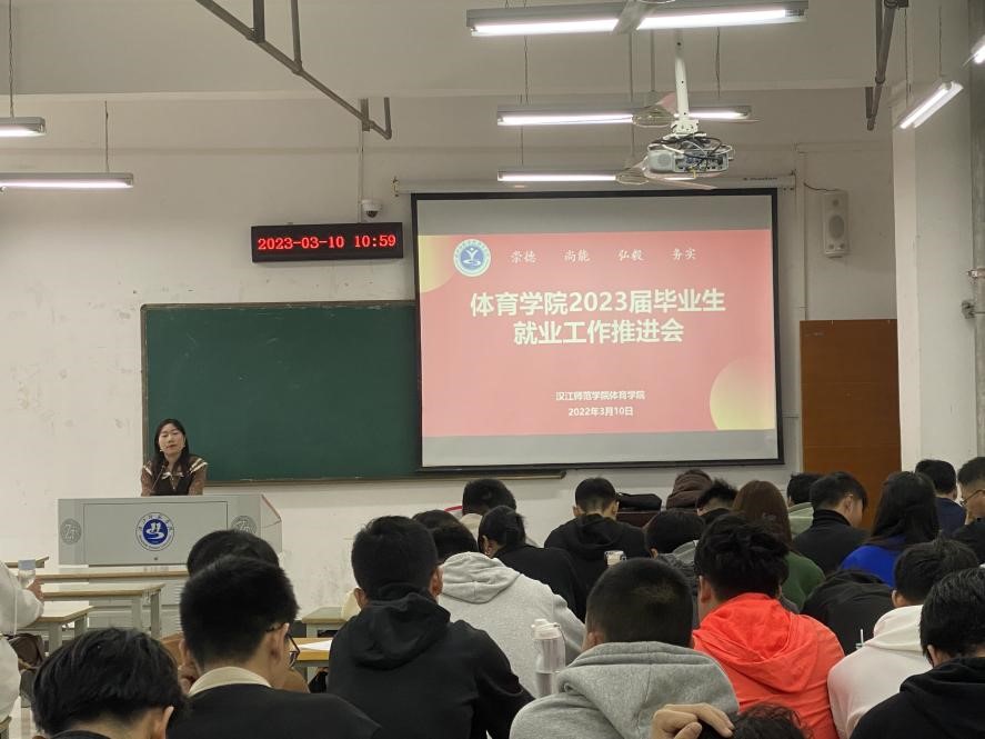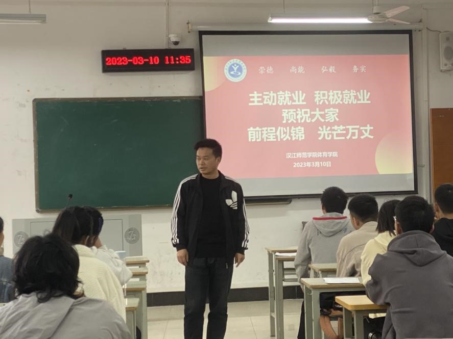 会上,辅导员陈文娜从就业形势、就业政策、就业措施、注意事项四方面向毕业生展开宣传,讲解考公、考编、参军入伍、三支一扶、西部计划等政策性基层就业制度,要求毕业生关注“汉师体育PLUS”、24365智慧就业微信公众号,2023届毕业生就业群等各类平台,及时获取就业信息,并重点介绍近期体育类招聘岗位,呼吁员工积极行动,抓住就业机会。