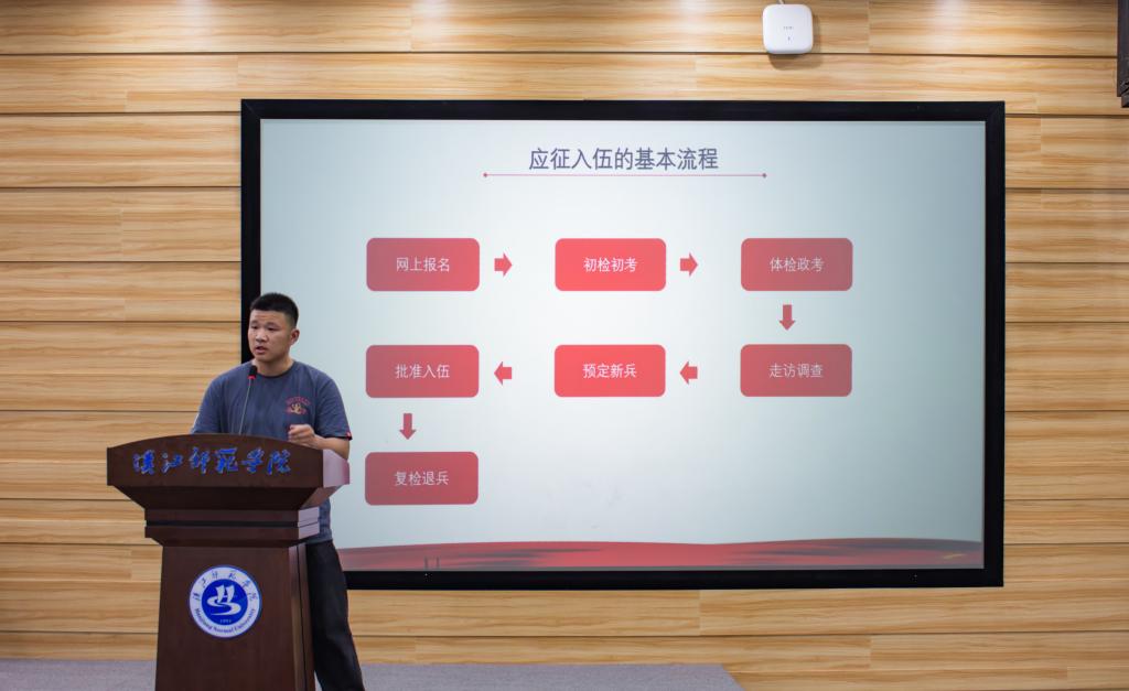 5月29日晚上20:00,威廉希尔2023年春季学期征兵政策宣讲活动在明理楼C101顺利举行。本次活动邀请到了退役老员工体教(专升本)2201班毛子进担任主讲嘉宾。威廉希尔各年级员工参会。毛子进结合自己的军旅生活故事,紧扣“参兵尽义务,戍边为国防”主题,生动有趣地介绍了征兵政策。
