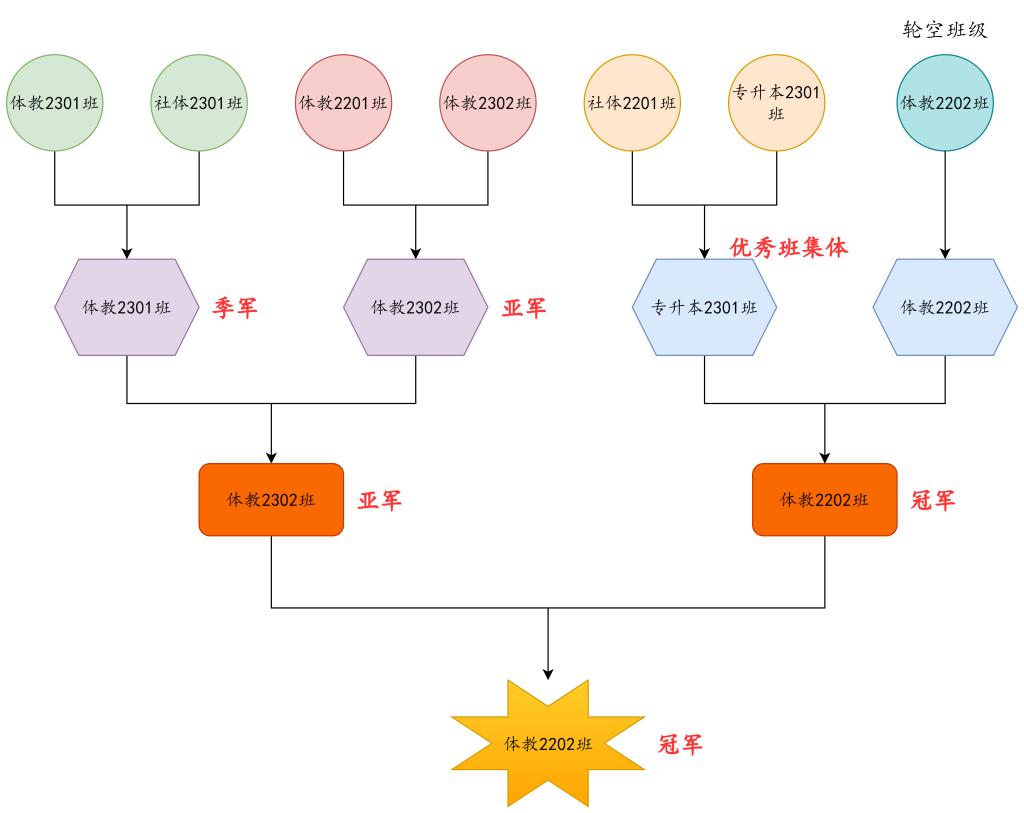 初赛的优胜班级晋级决赛,在决赛环节角逐总冠军、亚军和季军。最终,体本2202班勇夺桂冠,体教2302班荣获亚军,体教2301班获得季军。同时,专升本2301班凭借出色表现,被评为优秀班集体。