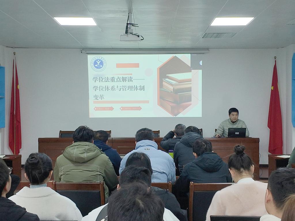 教学科研办公室主任周延首先带领全体教职员工认真学习了《中华人民共和国学位法》,包括总则、学位工作体制、学位授予资格、学位授予条件、学位授予程序、学位质量保障和附则。随后,他重点对《中华人民共和国学位法》中学位体系和管理体制两个方面的新变化进行了深入解读。