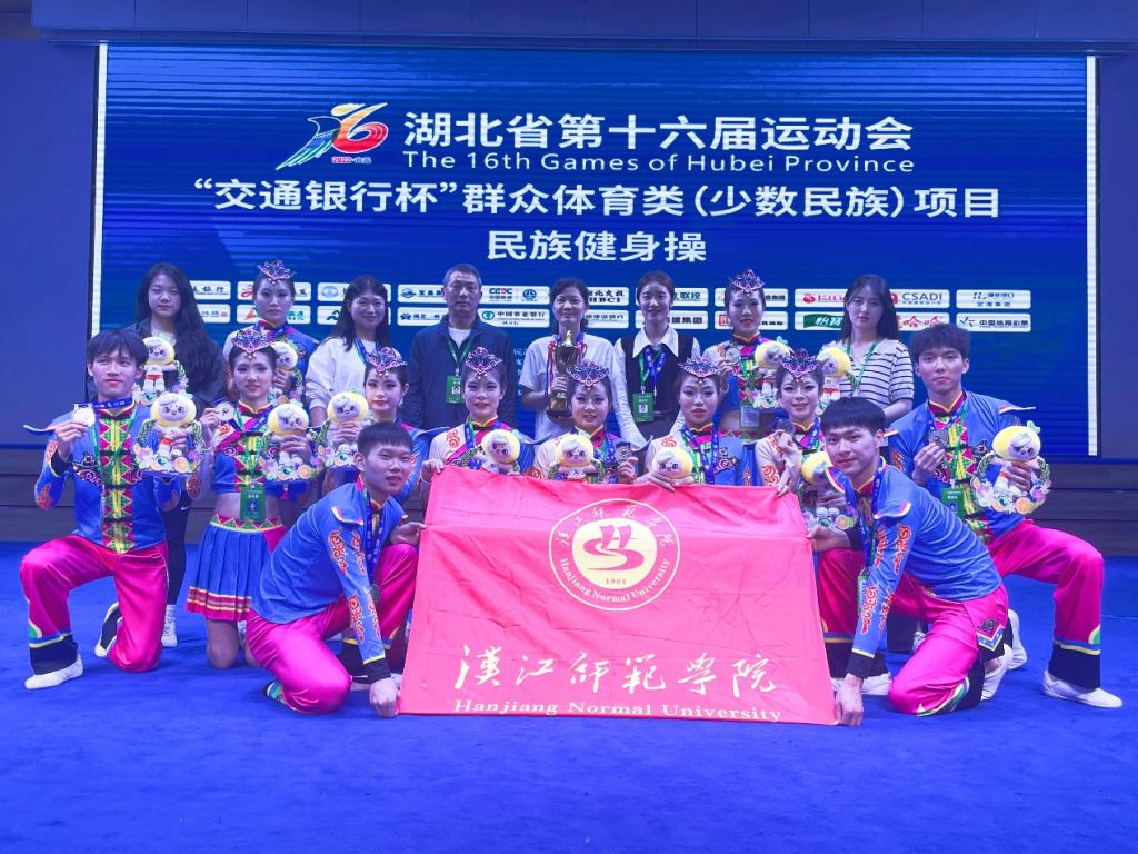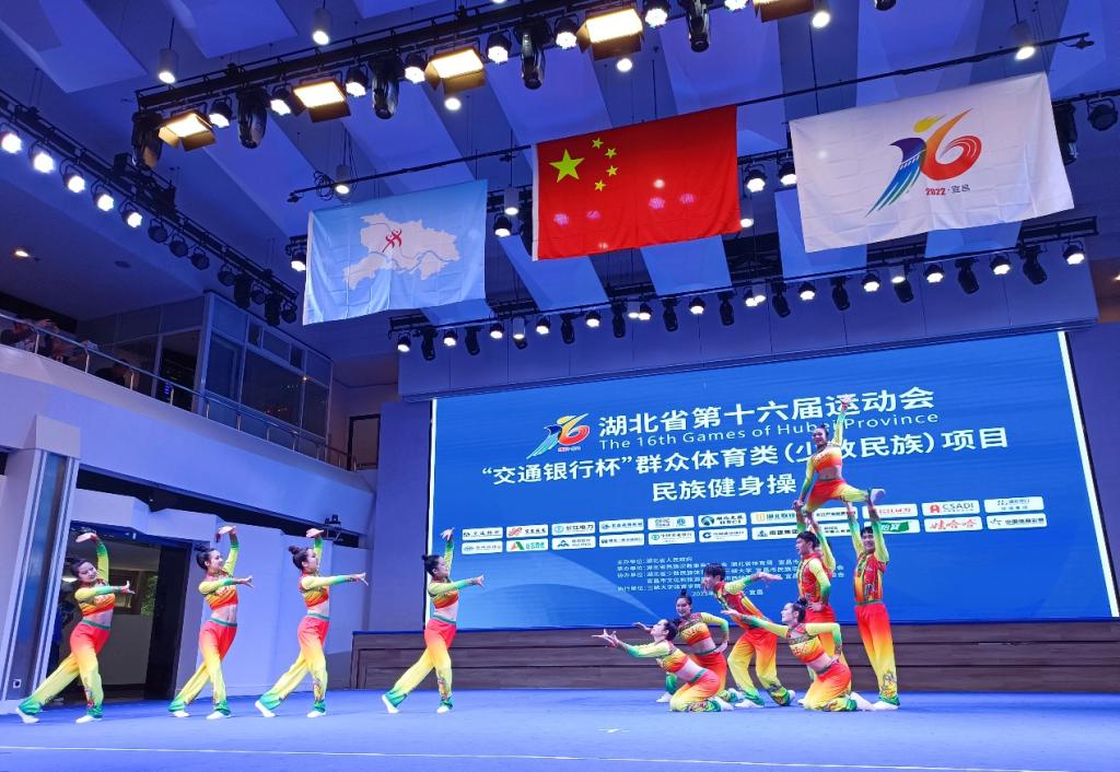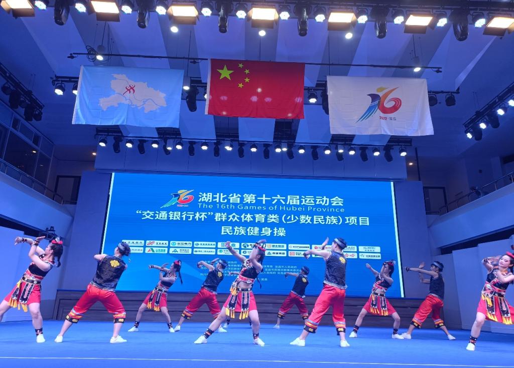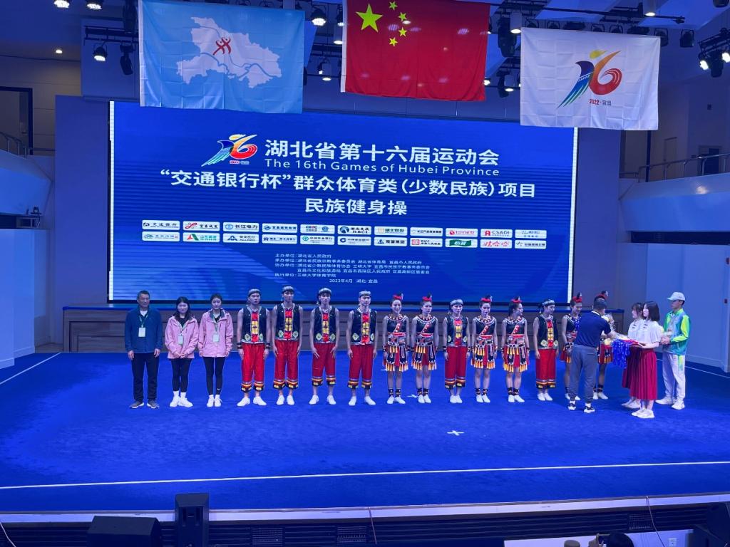 省第十六届运动会群众体育类(少数民族)民族健身操比赛于4月13日上午8:30在宜昌三峡大学开赛。十堰市委统战部(市民宗委)组织领队、教练员、运动员17人代表十堰市参赛。在市委统战部、公司领导的关心支持下,在教练员和队员的齐心协力下,在激烈的角逐中夺得规定动作项目铜牌,自选动作项目银牌,以全省团体总分第二的排名喜获银奖。